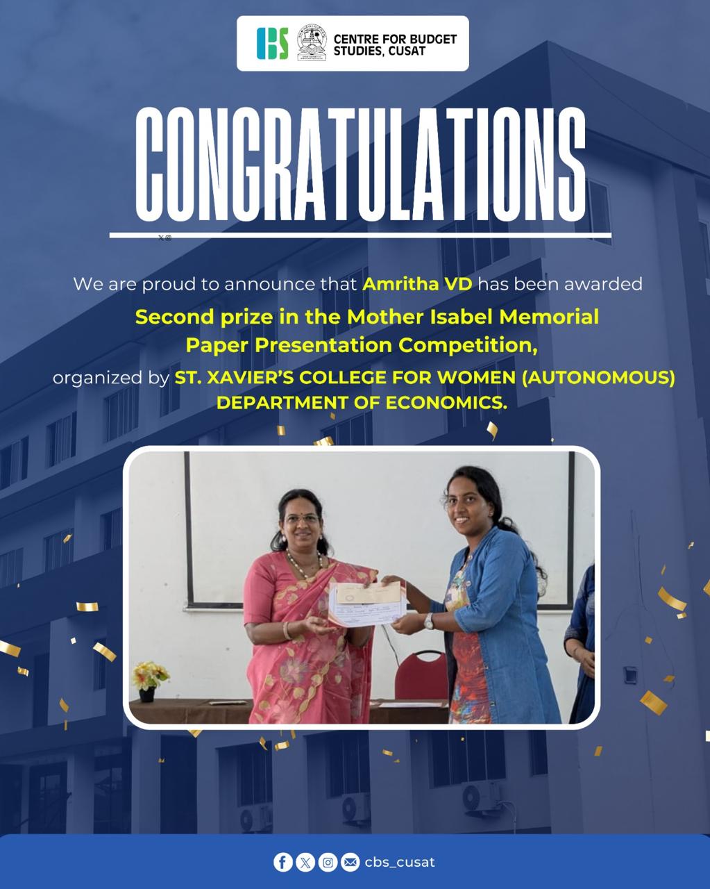 Congratulations to Amritha V. D. for winning Second Prize in the Mother Isabel Memorial Paper Presentation Competition, organized by the Department of Economics, St. Xavier’s College for Women (Autonomous)